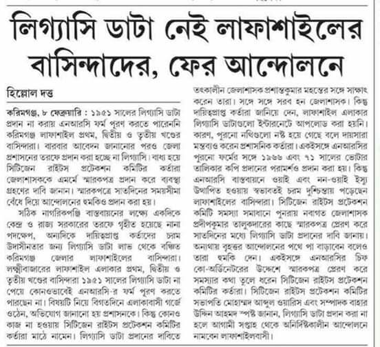 বৃহত্তর লাফাশাইল গ্রামের ১৯৫১ সনের লিগ্যাসি ডাটা ইন্টারনেটে আপলোড করা হয় নাই । এ নিয়ে জনগণের মধ্যে ক্ষোভ চরমে ।